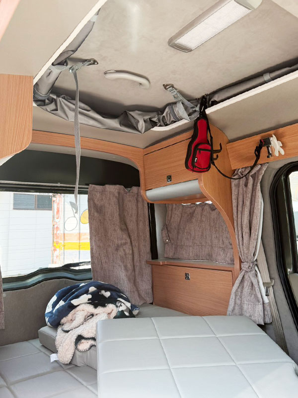 リアのベッドを展開すると、幅1020mmのベッドスペースに。ポップアップルーフもベッドスペースになります。